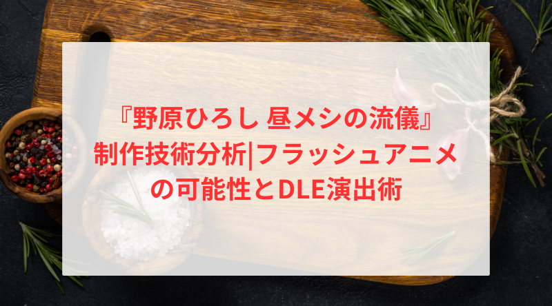 本作の特徴的な技術の一つが、「領域展開」と視聴者に呼ばれる演出である。ひろしが料理に集中する際、周囲が暗くなり、ひろしと料理だけがスポットライトを浴びる——この演出が、視覚的なインパクトを与えている。この演出は、フラッシュアニメーションの特性を活かしたものであり、背景を簡略化することで制作コストを抑えながら、効果的な演出を実現している。また、「隔離席」という演出も印象的である。ひろしが一人で食事をする際、周囲の客が見えなくなり、ひろしだけの世界になる——この演出が、ひろしの孤独と集中を視覚化している。これらの演出は、フラッシュアニメーションの制約を逆手に取り、独特の映像表現を生み出している。DLEの技術力が、本作の映像クオリティを支えている。制作期間が短く、予算が限られた中で、高いクオリティを維持する——この挑戦が、本作の成功に繋がっている。フラッシュアニメーションという手法が、本作のような作品を可能にしている。この技術の進化が、日本のアニメ業界に新たな可能性をもたらしている。