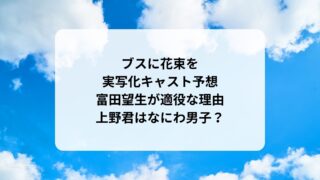 ドラマブスに花束をの実写化キャスト予想!高橋恭平や冨田望生?なにわ男子? 「ブスに花束を。」がアニメ化されることが2022年11月4日発売のコミック12巻(最終回)で発表されました。人気漫画で、実写化して欲しいという希望がツイッターで多く見られました。ブスに花束をが実写化されそうなドラマ枠「シンドラ」はジャニーズ...2022.11.042025.04.27ドラマ