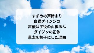 2023年1月ドラマすずめの戸締まり白猫ダイジンの声優は子役の山根あん!正体や草太を椅子にした理由 すずめの戸締まりの白猫のダイジンの声優は誰?子役の山根あんちゃん!上白石萌音さんだと予想していましたが違いました。ダイジンの正体や草太(松村北斗)を椅子に変えた理由をまとめます。2人が宮崎からフェリーで愛媛、淡路島、神戸、東京、宮城を旅をす...2022.10.272025.04.272023年1月ドラマ